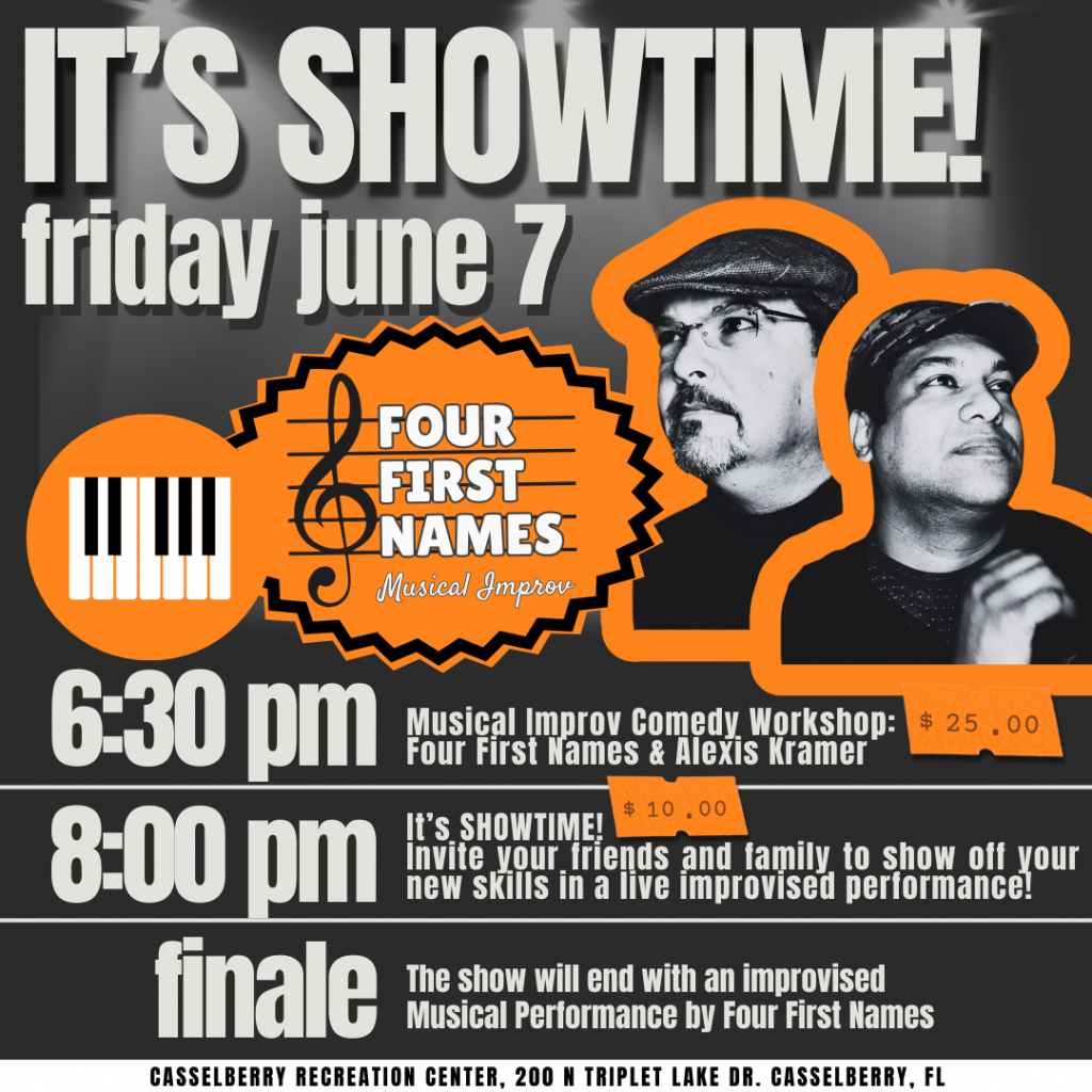 Following the workshop is your showcase followed by Four First Names Musical Improv Show! The entire thing is made up on the spot!