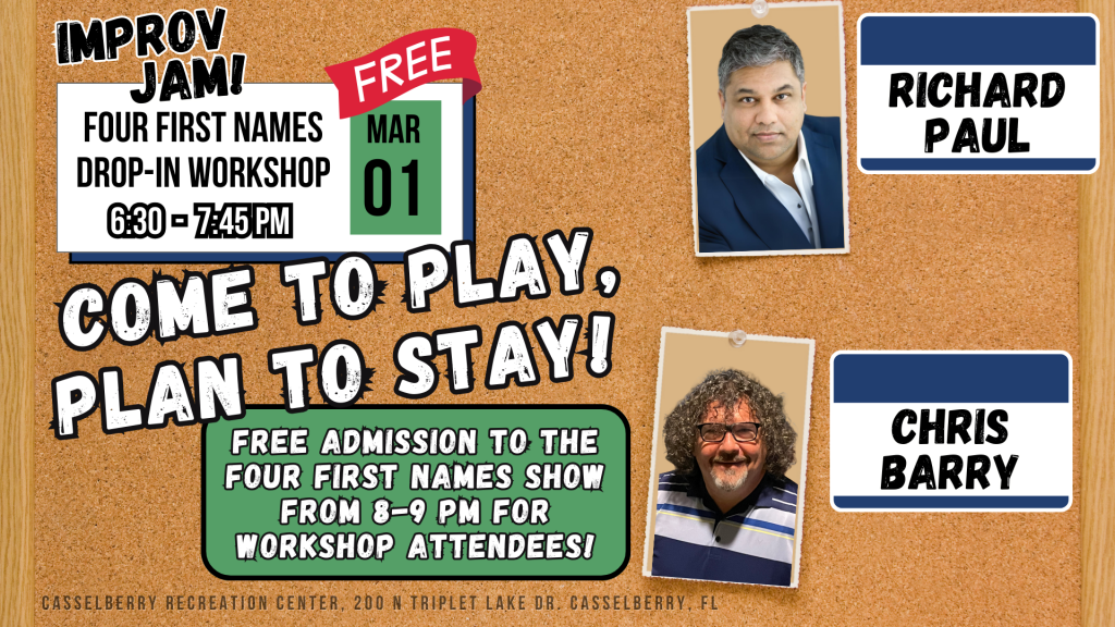 Join us for an evening of laughter, creativity, and fun at the Casselberry Corner Drop-In Workshop! This improv comedy workshop is led by troupes Four First Names and The Corner Gallery.
