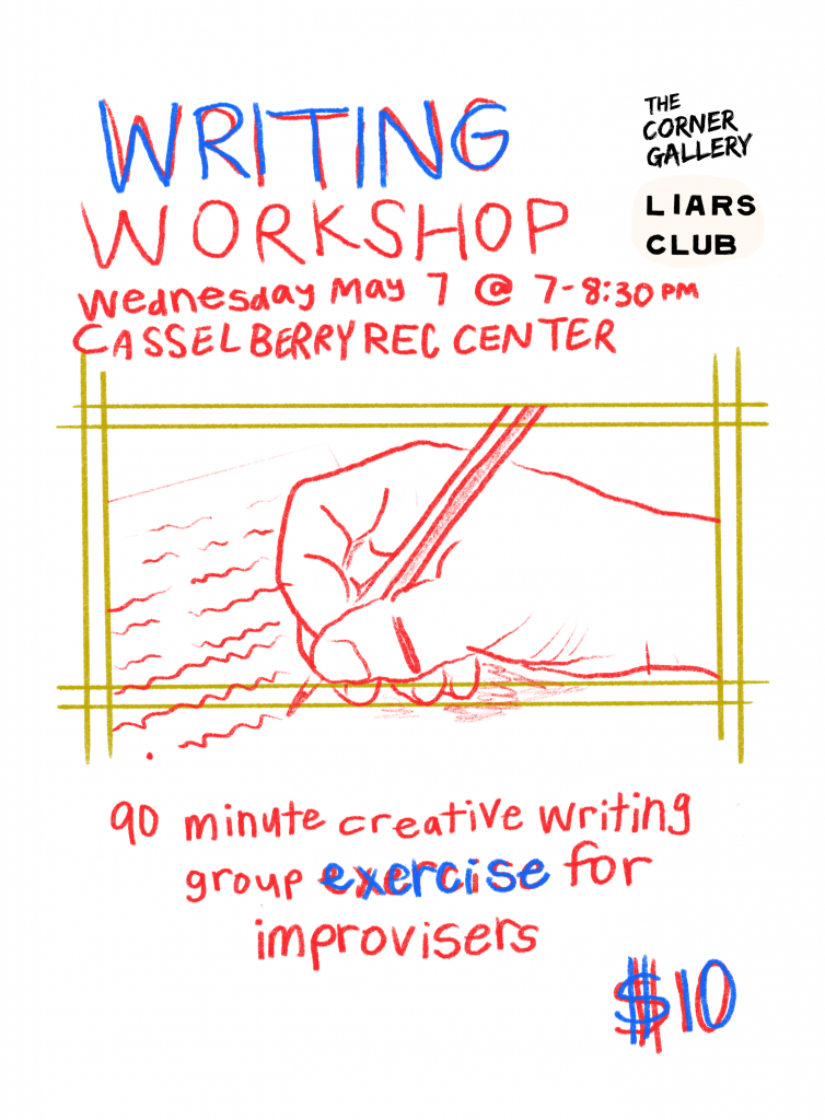 This is a 90-minute writing workshop for improvisers. Translate your learned skills from improv into writing. We’ll do an improv warm up or two, and then get into a writing exercise. Bring a pen and paper, or your favorite writing utensil and join us for a low-stakes good time.