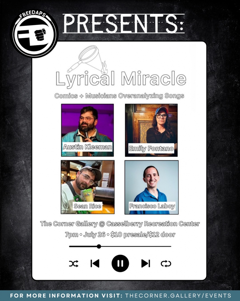 Lyrical Miracle is a show that features comedians and musicians each doing a 3-5 minute set about one lyric that they feel is either unjustly praised or unfairly derided and attempting to explain why using whatever means necessary.