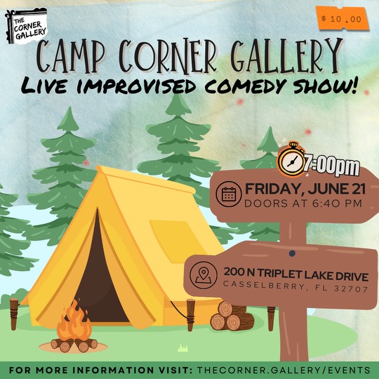 Throw on your badges, sunscreen and t-shirts that your mom wrote on the tag with–It’s Camp Corner Gallery! Join The Corner Gallery as they put on their signature ‘Diamond in the Rough” show. The theme of this show is Summer Camp so wear your best cargo shorts as we bring you back to summer camp! (It is a mosquito free environment.) It is all made up on the spot based on your suggestions.